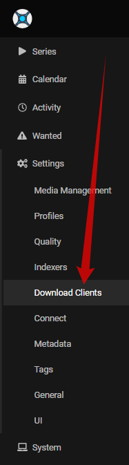 First, we navigate in Sonarr to the Settings => Download Clients tab.